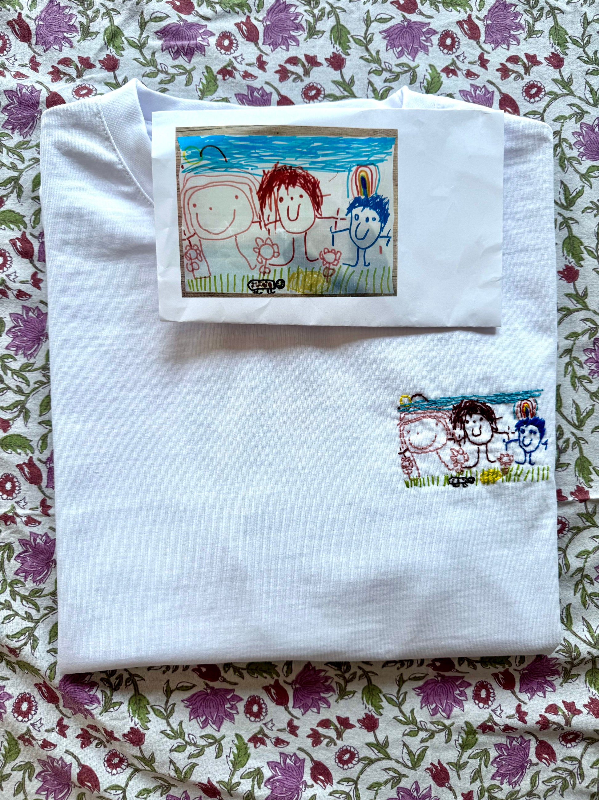 Keep your child's drawing close to your heart and make them feel proud of their creation by wearing it on your t-shirt.