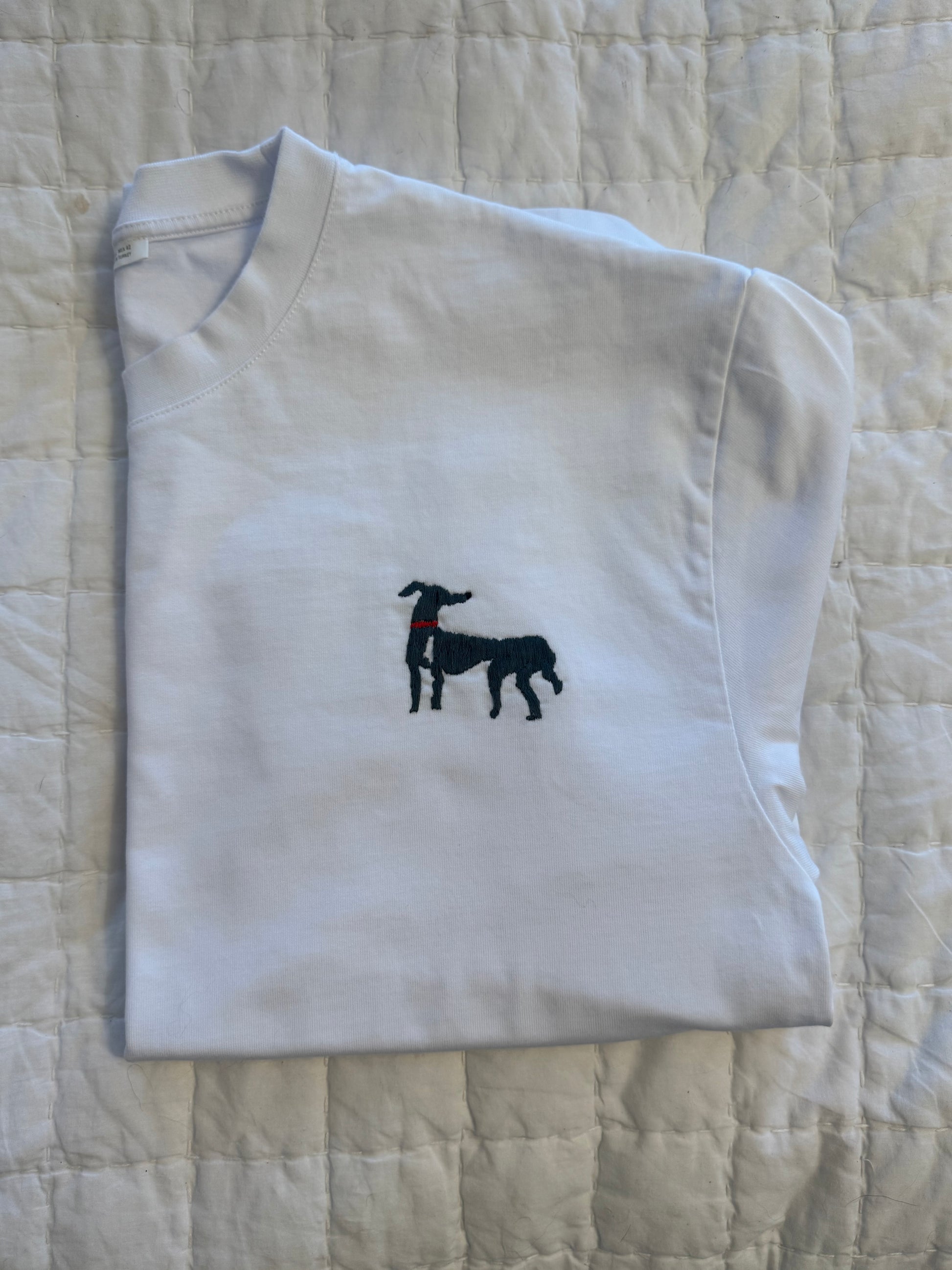 Each piece is hand embroidered onto a heavyweight 100% organic cotton t-shirt. (Not the Frame t-shirt that was a send in piece.)